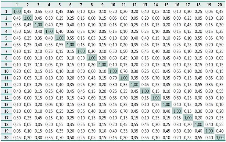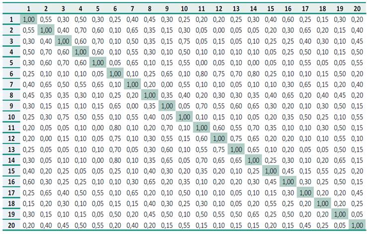 La matriz Aggregate Proximity (AGPROX) permitió la realización de los análisis de conglomerados jerárquicos y la escala multidimensional, se presenta en la Tabla 4.
