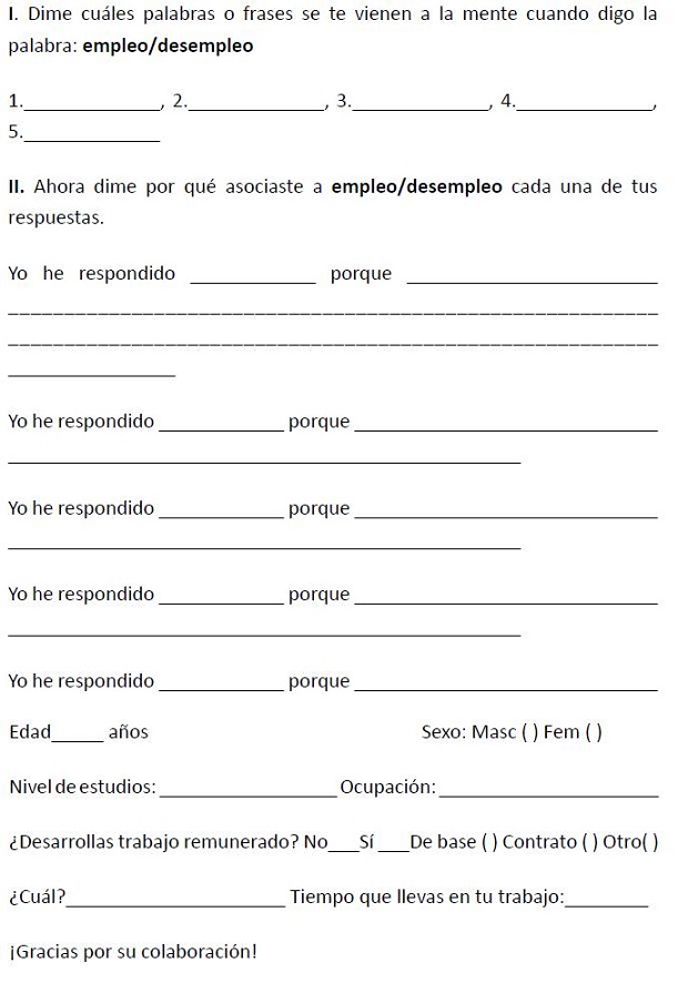 En el Anexo No. 1 se incluye el instrumento de listado libre utilizado en el estudio. Consiste en solicitar a los informantes un listado escrito de términos o frases relacionados con una esfera conceptual particular: Dime cinco palabras o frases que se te vienen a la mente cuando escuchas: empleo/ desempleo. Una vez escritas las palabras en el instrumento, se les pide una pequeña explicación de por qué dijeron cada una de ellas (las citas textuales usadas en el apartado de resultados provienen de dichas explicaciones). Luego de obtenidas las listas de palabras, se tabularon los términos por frecuencia de mención, lo que permitió escoger 20 términos a fin de generar el instrumento de pile sort (Bernard, 2006).