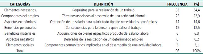 Las categorías más relevantes para los participantes en el estudio son los elementos necesarios y los componentes del empleo, así como el aspecto económico. El primero se refiere a los requisitos para la realización de un trabajo, incluye competencias (educación, capacidad, especialización: para obtener un buen trabajo hay que estudiar), valores (constancia, honestidad, compromiso: si las cosas no se hacen con el cuidado adecuado solo se harán mal), otras características positivas (responsabilidad, disciplina, vocación, determinación, dedicación, puntualidad, esfuerzo: si tenemos empleo hay que sacrificarnos por cumplirlo) y requiere de tener la oportunidad de llevarlo a cabo (tener un empleo es una oportunidad que no muchos tienen). La segunda categoría, componentes de empleo, incluye términos asociados al desarrollo de una actividad laboral (horario, empresa, jefe, ocupación, labor, etc.); en un empleo exigen el cumplimiento de ciertas horas, el empleo garantiza que el personal adquiera una ocupación dentro de una empresa. Y la categoría de aspecto económico considera la obtención de un salario para cubrir todo tipo de necesidades económicas, es lo que uno recibe a cambio del empleo, por triste que parezca, sin dinero no se sobrevive.