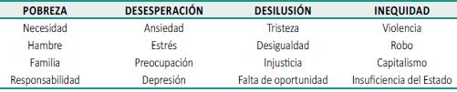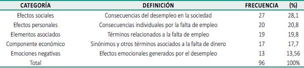 Las tres categorías más relevantes para los participantes son los efectos sociales y personales, además de los elementos asociados al desempleo. La primera incluye las consecuencias del desempleo en la sociedad como son situaciones delictivas (robo, violencia, uso de armas, fraudes, etc.: la falta de dinero genera conseguirlo por modos violentos), impactos comunitarios (injusticia, desigualdad, inequidad, corrupción, etc.: el desempleo es el resultado de malas políticas y agentes corruptos que desangran a los países) y otros movimientos colectivos (desplazados, disturbios, etc. al no haber empleos las personas buscan la manera para ser escuchadas y ser tomadas en cuenta). La segunda categoría en importancia son los efectos personales: consecuencias individuales por la falta de empleo (problemas, necesidades, complicaciones, retroceso, estrés, etc.): al no tener un empleo no produzco dinero para satisfacer mis necesidades, se dan cambios en el hogar de un desempleado. Los elementos asociados a la falta de empleo considerados incluyen aspectos relacionados con el sistema social (capitalismo, insuficiencia del Estado, mala política, monopolios, etc.: no se tiene un buen plan de gobierno para generar empleo y oportunidades, gracias al monopolio de pequeños sectores se incrementa el desempleo), la falta de oportunidades: si existieran más ofertas de empleo no existiría una tasa tan alta de personal desempleado y el tiempo perdido: tiempo que no se va aprovechar realizando labores.