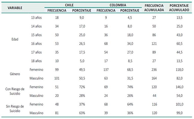 La muestra se compone así: 99 participantes de género femenino y 101 participantes de género masculino en Chile, y 137 participantes de género femenino más 63 participantes de género masculino en Colombia. Para el análisis de los datos se conformaron dos grupos: el grupo sin riesgo de suicidio o control (chilenos y colombianos) y el grupo con riesgo de suicido (chilenos y colombianos).