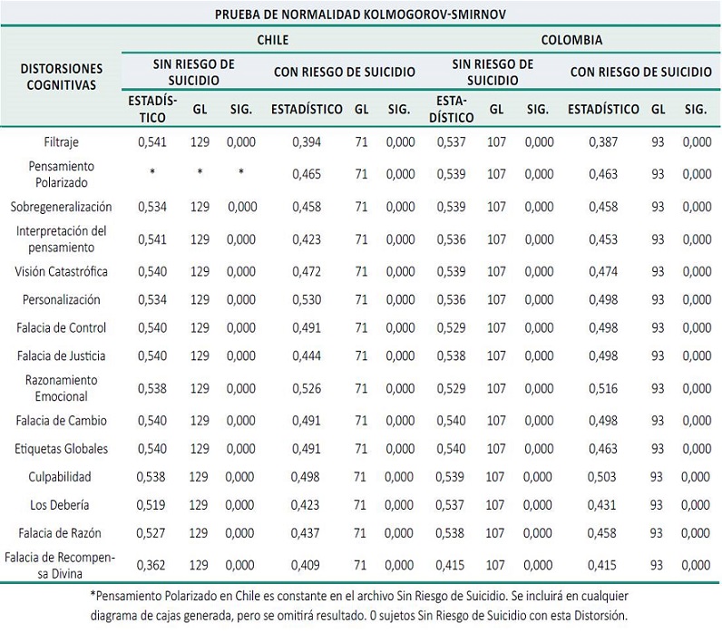 En la Tabla 5 se evidencia que los datos en la muestra completa no presentan distribución normal (α < 0,05). Además, de las 15 distorsiones cognitivas evaluadas, la correspondiente a Pensamiento Polarizado no se identificó en ninguno de los participantes chilenos del grupo sin riesgo de suicidio (Ver Tablas 4 y 5).