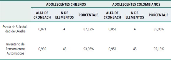 Detecta el riesgo de suicidio en adolescentes, sin la necesidad de un diagnóstico psiquiátrico previo a su aplicación. La escala está validada en adolescentes chilenos con un coeficiente Alfa de Cronbach de 0,89 (Salvo, Melipillán & Castro, 2009) y ha sido utilizada en población adolescente de países como México (Perales-Blum & Loredo, 2015), Perú (Gutiérrez & Mora, 2017) y Ecuador (Pulla, 2017). Asimismo, el Alfa de Cronbach realizado en este estudio, indica que el coeficiente de fiabilidad de esta escala en adolescentes colombianos es de 0,851, y en adolescentes chilenos de 0,871, tal como se observa en la Tabla 1.