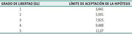 Por otra parte, para la prueba estadística Chi cuadrado (χ²), se supuso un nivel de significancia de α = 0.05 y los valores que determinaron el límite del grado de aceptación de la hipótesis, de acuerdo con el nivel de significancia y los grados de libertad (gl) son los siguientes: