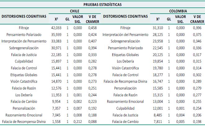 Respecto a dicha relación entre las variables de la investigación, se observa que todas las distorsiones cognitivas presentan una relación estadísticamente significativa con el riesgo de suicidio en la muestra de adolescentes chilenos y colombianos, salvo la Falacia de Recompensa Divina en los participantes chilenos, de manera que las distorsiones cognitivas dan cuenta de cierta predisposición para procesar información (Gutiérrez, Ceniceros & Méndez, 2012), provocando una disminución de las respuestas adaptativas.