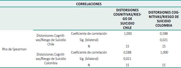 Results: A significant relationship between the cognitive distortions and the suicide risk was found, and the following presented the highest intensity between Chilean and Colombian individuals: Filtration, Interpretation of Though, Polarized Though and Overgeneralization). Moreover, the relationship between the results in Chilean and Colombian adolescents was positive and strong.
