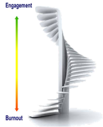 Sin embargo, otros investigadores sostienen que el binomio burnout-engagement no representa polos opuestos, sino que, simplemente, se trata de constructos diferentes. Salanova y Llorens (2008) reflexionan que el engagement va mucho más allá que el solo hecho de no sentirse agotado, molesto o quemado, ya que su finalidad es alcanzar una experiencia óptima; a su vez, la ausencia de engagement no implica, necesariamente, que la persona se encuentre desgastada. En este sentido, la relación entre ambos constructos puede interpretarse como un movimiento espiralado que bien puede ser descendente, si está marcado por vivencias negativas; o ascendente, si se orienta hacia las experiencias positivas en su máxima expresión (Salanova et al., 2005) (Ver Figura 1).