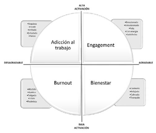 Otro modelo de análisis que vincula ambos conceptos es el modelo circunflejo de afecto, que permite diferenciar cuatro experiencias distintas vinculadas al trabajo: el engagement, el bienestar laboral, la adicción al trabajo y el burnout (Bakker & Oerlemans, 2011) (Ver Figura 2).
