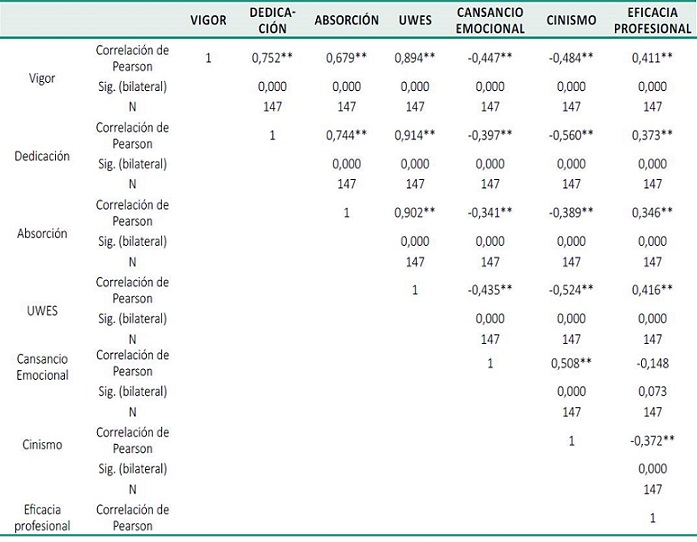 Por otra parte, todos los factores que miden aspectos positivos correlacionaron entre sí. Observamos que la eficacia profesional (tercera dimensión del burnout), correlaciona positivamente con el engagement general UWES (r=0,416; p≤0,01) y con sus tres subescalas: vigor (r=0,411; p≤0,01); dedicación (r=373; p≤0,01), absorción (r=0,346; p≤0,01).