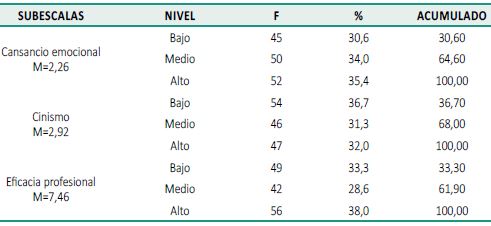 En una primera instancia se realizaron análisis descriptivos de cada uno de los constructos por separado utilizando puntajes en escala 10 a fin de facilitar su posterior lectura. Si analizamos los valores obtenidos en rangos, observamos que alrededor de un tercio de los participantes presenta un perfil típico de desgaste, caracterizado por elevados niveles de cansancio emocional (35,4%) y cinismo (32%) acompañados de sentimientos de baja eficacia profesional (33,3%) (Ver Tabla 1).