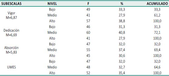 Compuesto por 17 ítems, que permiten obtener una medida única o identificar mediciones para sus tres dimensiones. Así, los participantes indican la frecuencia con que experimentan distintos sentimientos respecto de su trabajo, a partir de una escala Likert que va de 0 (nunca) a 6 (todos los días). En nuestro estudio, el UWES presentó elevados niveles de consistencia interna, según el Alpha de Cronbach, lo que garantiza la fiabilidad de la prueba: Vigor (α=0,775); Dedicación, (α=0,787) y Absorción (α=0,716). Y, para la escala unidimensional UWES (α=0,898).