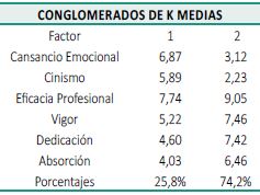 Como se desprende de la Tabla 4, es posible identificar dos conglomerados. El primero de ellos, representa al 25,8% (n=38) de los participantes, quienes poseen niveles de cansancio emocional y cinismo más elevados que el otro grupo y, consecuentemente, puntuaciones inferiores en las subescalas de engagement, con valores cercanos a la media. El segundo conglomerado, es el más representativo, con un 74,2% (n=109) de los participantes, quienes puntúan bajo en cansancio emocional y cinismo, mientras obtienen altas valoraciones en los factores positivos de engagement y mantienen más elevados sus niveles de eficacia profesional.