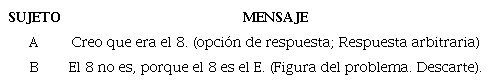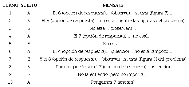 En la ejemplificación se observa cómo se aplica esta lógica en el mensaje 1, donde el sujeto A observa la opción 6 y la descarta por ya estar presente en una de las figuras de la parte superior. En los mensajes 2, 4 y 6 se evalúan las opciones de respuesta 3, 7 y 4 bajo la misma lógica; al no percibir estas opciones en la parte superior de la hoja se las mantienen como posibles respuestas. Luego, siguiendo la misma idea se descarta la opción 8 por ya estar presente en la figura H. Finalmente, se termina decidiendo la respuesta final (opción 7) por un criterio poco fundamentado, sin apelar en ningún momento a la relación de sentido lógico subyacente en el problema.
