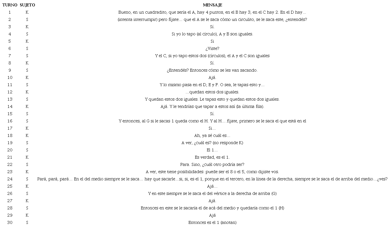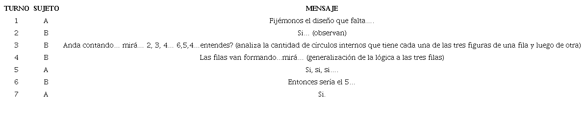 En segundo lugar, un nivel intermedio de razonamiento correspondió a la modalidad descriptiva. Esto representa una superación con respecto al nivel previo, en tanto la díada intenta fundamentar la solución a partir de la descripción fenomenológica de las figuras del problema, aunque sin llegar a construir una relación de sentido entre las mismas que supere los aspectos estrictamente perceptuales. Por último, el nivel más avanzado de razonamiento correspondió a las dos modalidades de construcción de la respuesta basadas en el establecimiento de una relación de sentido entre las figuras del problema. Al interior de este grupo, es posible diferenciar dos subniveles: la construcción parcial de sentido, por filas o por columnas; la construcción total de sentido, integrando las lógicas de filas y de columnas.