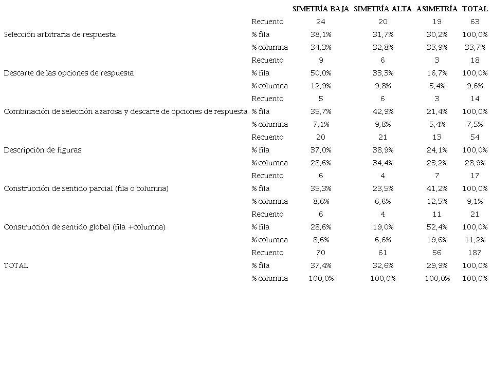 Los porcentajes totales por columna indican que, independientemente de la composición sociocognitiva de la díada, la mayor parte de los segmentos observados (62,6%) fueron respuesta arbitraria (33,7%) y descripción de figuras (28,9%). El resto de los segmentos se distribuyó de manera más o menos similar entre sí, aunque con menores frecuencias: descarte de opciones de respuesta (9,6%), combinación respuesta arbitraria y descarte (7,5%), construcción de sentido parcial (9,1%) y construcción de sentido global (11,2%).