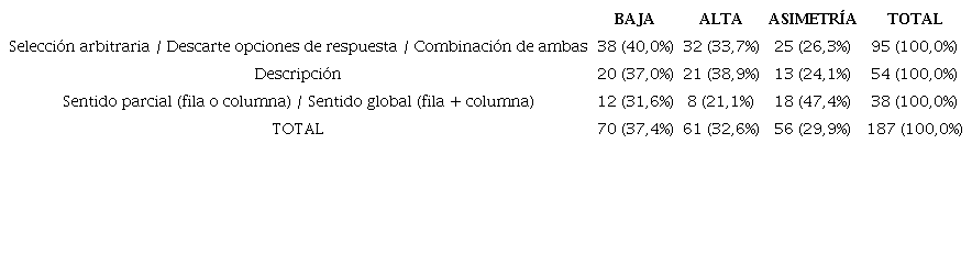 Resultados: El análisis de las interacciones permitió identificar seis modalidades básicas de razonamiento, que fueron desde un nivel inicial basado en una selección arbitraria de la respuesta, hasta un nivel de alta complejidad basado en la construcción de sentido lógico integrando filas y columnas. Por otra parte, las modalidades más rudimentarias (ensayo-error) predominaron en las díadas con simetría baja (40,0%), mientras que las más avanzadas (de construcción de sentido entre filas y/o columnas) así lo hicieron en las díadas asimétricas (47,4%).