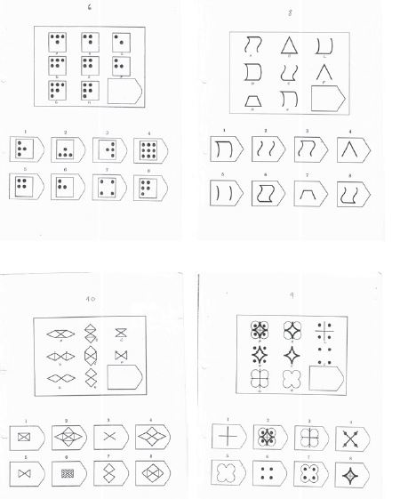 Cada ítem estaba constituido por ocho figuras (en realidad, la novena estaba ausente) distribuidas en tres filas y tres columnas, que mantenían una relación de sentido lógico entre sí. Así, la resolución de cada ítem implicaba deducir esta relación de sentido entre las ocho figuras presentes y detectar la novena figura ausente. Para ello, se disponía de una serie de ocho opciones de respuesta, entre las cuales figuraba aquella que completaba de manera correcta la secuencia lógica. La correcta y auténtica resolución de cada ítem implica deducir relaciones lógicas en dos sentidos posibles: por un lado, únicamente por filas o únicamente por columnas (uno de ambos); por el otro, logrando la integración de las lógicas por filas y por columnas, lo cual supone un nivel más complejo y global de elaboración cognitiva que el anterior.
