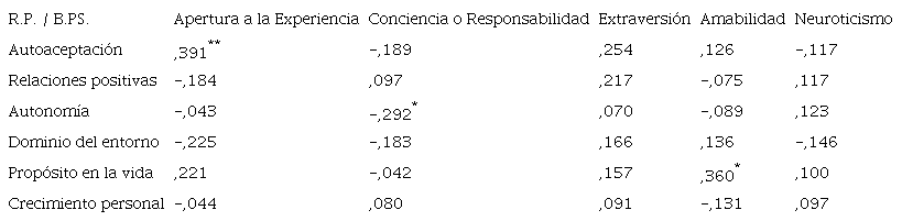 El análisis de la relación existente entre rasgos de Personalidad y Bienestar Psicológico en la muestra estudiada, se presenta en la Tabla 1. Destaca una relación positiva media significativa entre Apertura a la experiencia y Autoaceptación (rho=0,391, p<0,01), al igual que entre Amabilidad y Propósito en la vida (rho=0,360, p<0,05). Por otra parte, se devela una relación negativa débil significativa entre Conciencia/responsabilidad y Autonomía (rho=0,292, p<0,05).