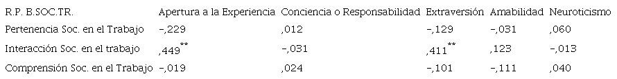 La Tabla 2, que se presenta a continuación, describe las relaciones entre rasgos de Personalidad y Bienestar Social en el trabajo, destacando las relaciones significativas positivas medias entre Apertura a la experiencia e Interacción Social en el trabajo (rho=0,449, p<0,01), al igual que entre Extraversión e Interacción Social en el trabajo (rho=0,411, p<0,01).