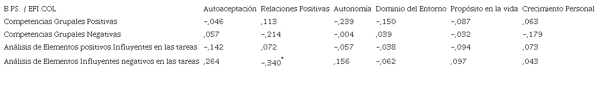 A continuación, podemos observar la relación entre Eficacia Colectiva en el trabajo y Bienestar Psicológico. La Tabla 3 nos revela una relación significativa negativa débil entre Análisis de elementos Negativos influyentes en las tareas y Relaciones Positivas (rho=-0,340, p<0,05).