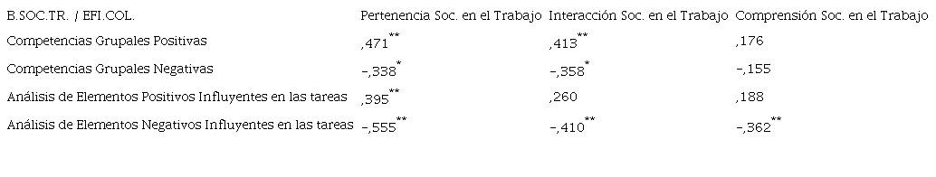 Finalmente, la Tabla 4 nos muestra la relación entre Eficacia Colectiva en el trabajo y Bienestar Social en el trabajo. El análisis revela una relación significativa positiva media entre Competencias Grupales Positivas y Pertenencia Social (rho=0,471, p<0,01) e Interacción Social en el trabajo (rho=0,413, p<0,01). También se observa una relación significativa negativa débil entre Competencias Grupales Negativas y Pertenencia (rho=-0,338, p<0,05) e Interacción Social en el trabajo (rho=-0,358, p<0,05).