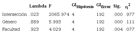 Se comenzó por analizar la igualdad de varianzas y covarianzas de las variables dependientes verificándose su cumplimiento. Dado este resultado se optó por la lectura del estadístico Lambda de Wilkis para examinar las hipótesis subyacentes al análisis en cuestión (Huberty & Petoskey, 2000). Se verificaron así efectos multivariados significativos para las variables género y facultad (Tabla 1).