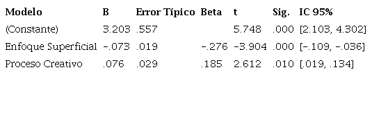 Yendo ahora al análisis del efecto de las variables independientes sobre la dependiente, se tiene en primer lugar al estadístico B que informa que por cada punto en que el enfoque Superficial decrece y el Proceso Creativo aumenta, el rendimiento académico mejora en 0,073 y 0,076 puntos respectivamente. Además, se observa que el 27,6 % de la variabilidad del enfoque Superficial y el 18,5 % del Proceso Creativo se encuentran relacionados con la explicación del rendimiento académico (Tabla 2).