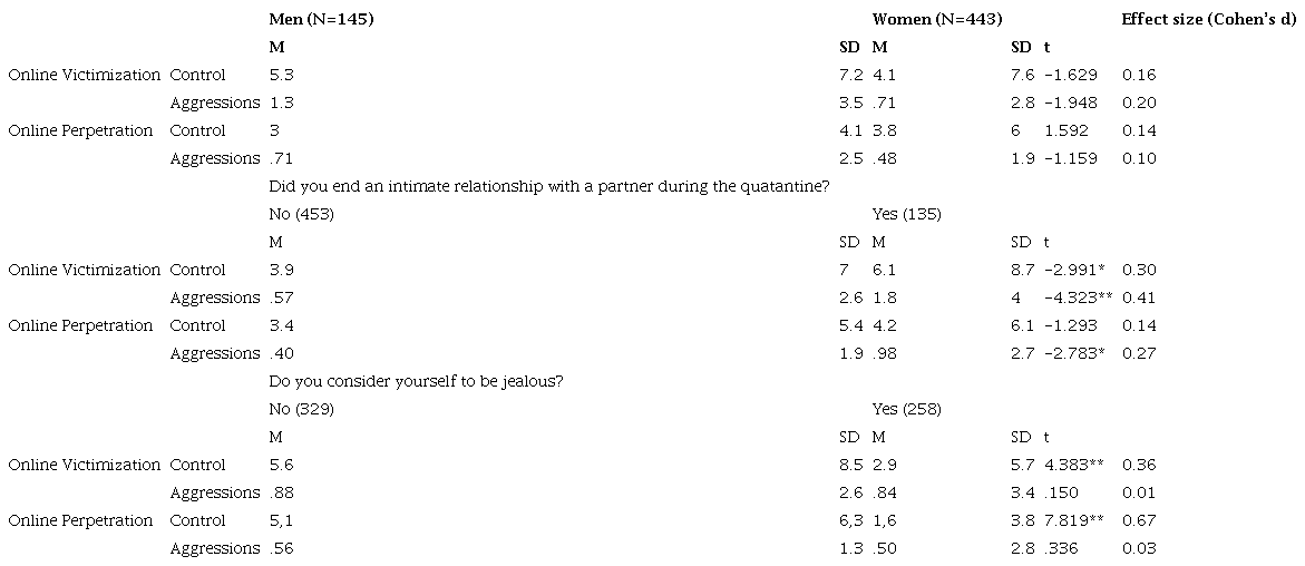 When comparing online violent behaviour between men and women, no statistically significant differences were found by sex. When analysing said behaviours in relation to being in a relationship or having terminated a relationship during the quarantine, greater and more statistically significant differences were found in those who had ended a relationship during the quarantine, in the victim of control and aggression factors, in addition to significant differences in the online aggression perpetration factor. In the same vein, the people who describe themselves as jealous with their partner, present greater and more significant differences in the control factor, in perpetration as well as in victimization (see Table 2).
