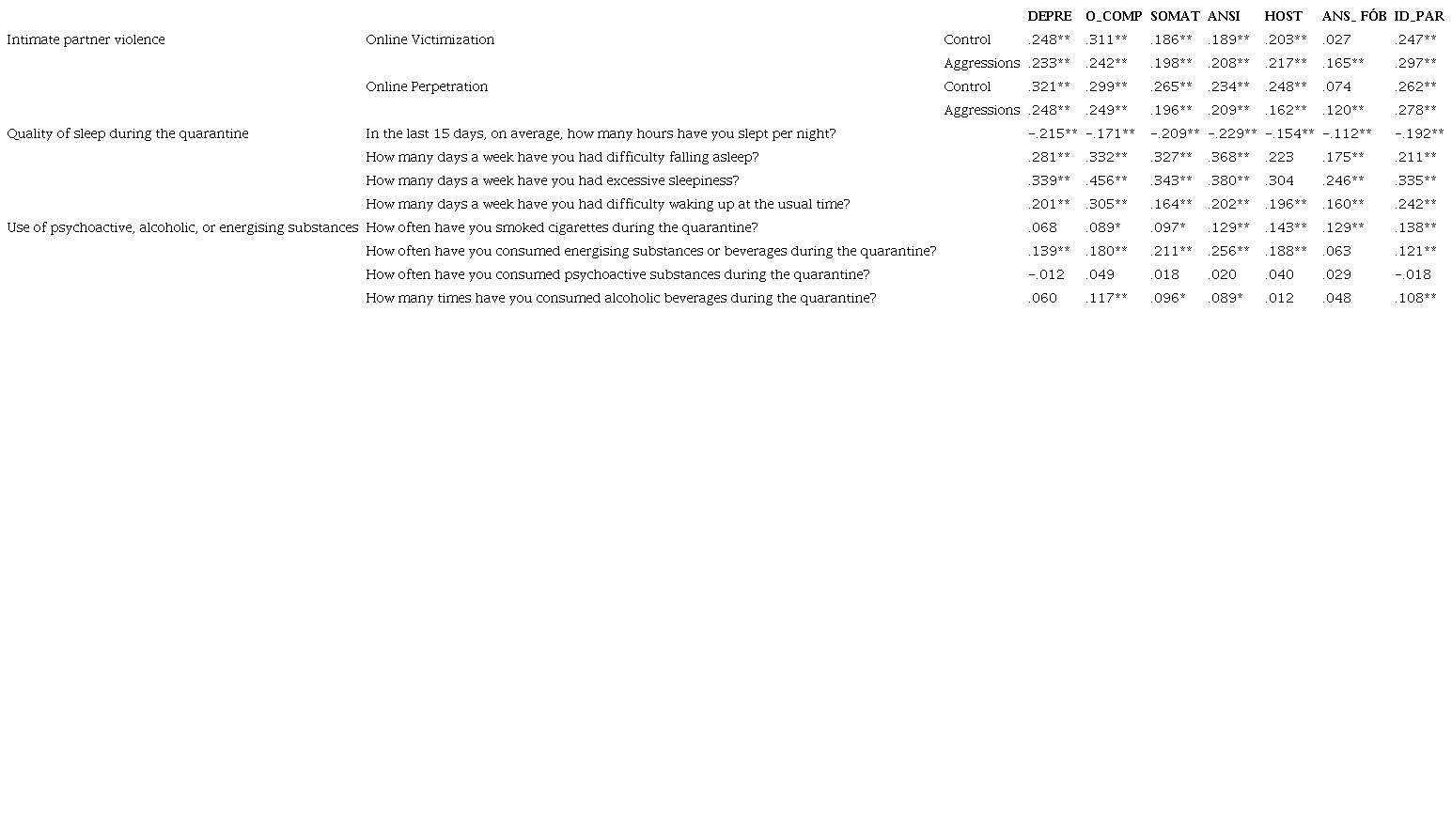 At the same time, the frequency of controlling behaviours and aggressions perpetrated by electronic means correlated significantly with all the symptoms mentioned, except for phobic anxiety, which did not correlate with the controlling behaviours perpetrated. It is possible that these symptoms are a reflection of the emotional load generated by the stressful circumstances that result from the confinement, increasing the probability of perpetrating a violent behaviour towards a partner among those who show individual and contextual characteristics that favor this type of violence. On the other hand, it is possible that some participants present mental disorders, a circumstance that increases the risk of perpetrating domestic violence (Mazza et al., 2020; Yu et al., 2019).