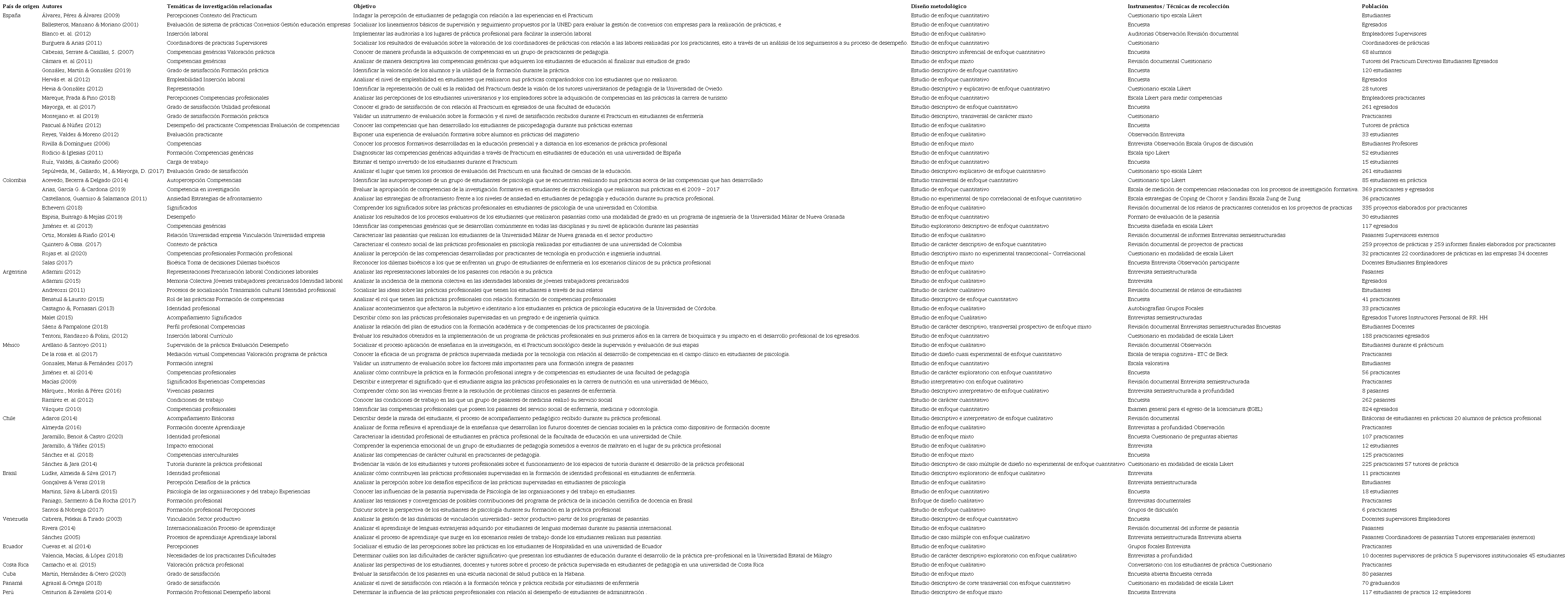 Métodos: O artigo seguinte apresenta uma revisão sistemática do escopo descritivo onde as publicações entre os anos 2000 a 2020, relacionadas ao tema sobre estágios profissionais, foram pesquisadas nas bases de dados Redalyc, Scielo e Dialnet. Inicialmente, do total de 308 estudos obtidos, procedemos à filtragem por sua relevância e, finalmente, 64 artigos empíricos foram obtidos, sistematizados e abordados a partir da análise temática.