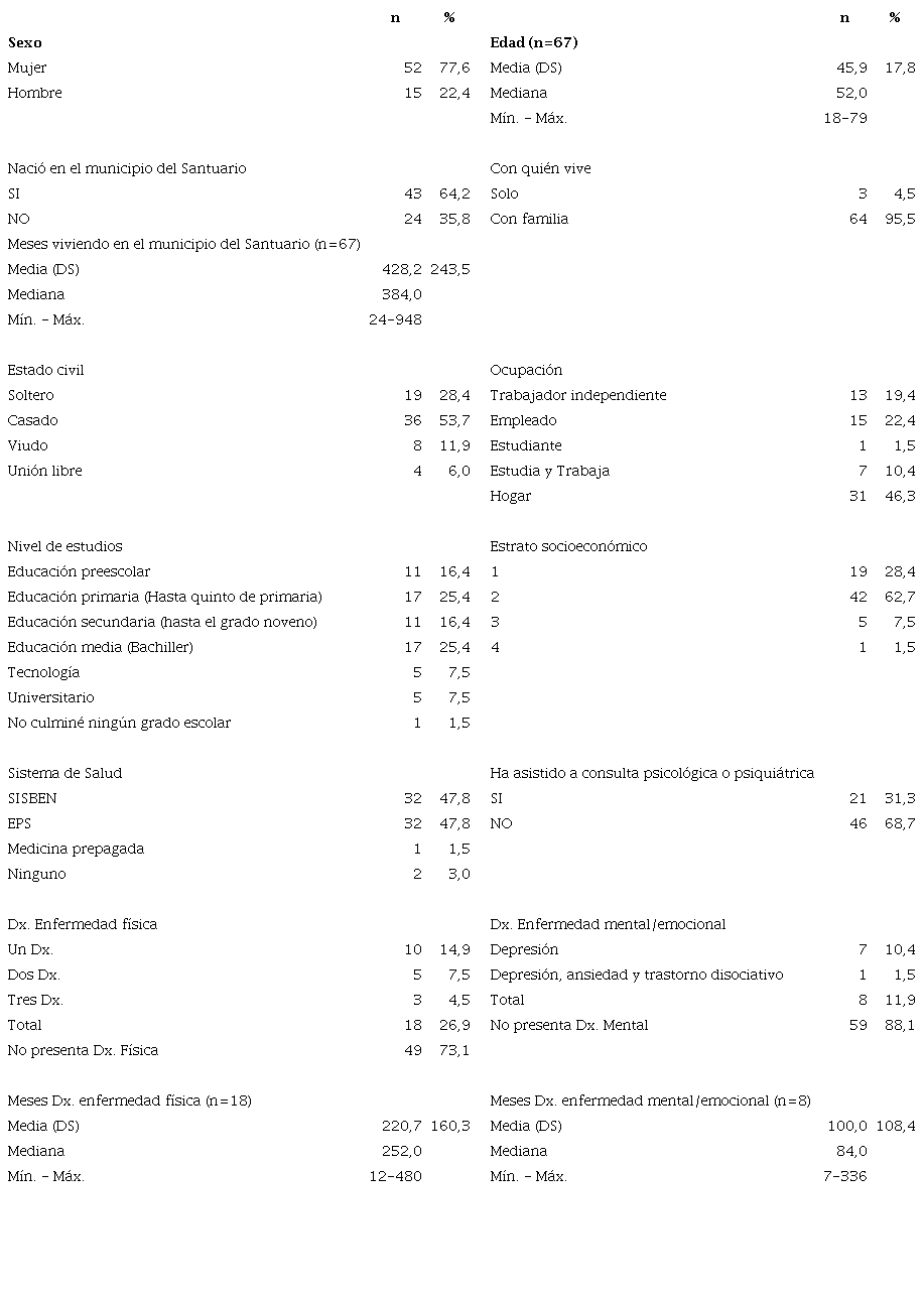 En la Tabla 1. se aprecia que gran parte de los 67 participantes de este estudio fueron mujeres (77,6 %) adultos 18 y 79 años (media edad= 46). La mayoría nació en el municipio de El santuario, Antioquia (64,2 %) y gran parte llevaba viviendo alrededor de 36 años en dicho municipio con sus familias (95,5 %). La mayoría de la muestra eran de estado civil casados (53,7 %), de ocupación dedicados al hogar (46,3 %) o trabajaban (41,8 %), y quienes tenían un nivel de básica primaria hasta educación media (67,2 %). De otro lado, gran parte de la muestra (n=61) pertenecían al estrato socioeconómico colombiano bajo, nivel 1 y 2 (91,0 %).