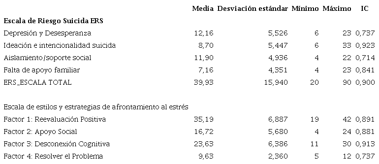 En relación con la Escala de Riesgo Suicida (ERS) hubo una puntuación media de 12,16 en la dimensión de Depresión y Desesperanza, de 8,70 para la dimensión de Ideación e intencionalidad suicida; de 11,90 en la dimensión de Aislamiento/soporte social y de 7,16 en la dimensión de Falta de apoyo familiar. En la escala total del ERS se encontró una puntuación media de 39,93. Lo que indica que no hay niveles clínicamente significativos de riesgo suicida en esta muestra de estudio.
