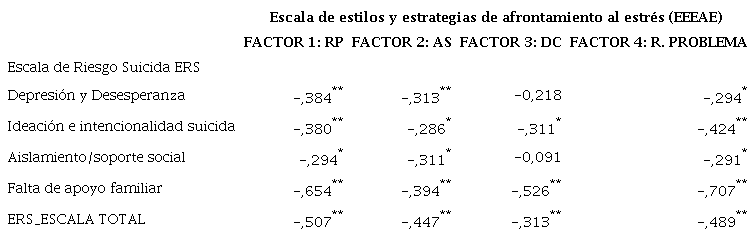 Se aprecia a nivel general en la Tabla 3, correlaciones negativas entre todas las dimensiones de la escala ERS y su escala total con los cuatro factores que comprende la Escala de estilos y estrategias de afrontamiento al estrés (EEEAE), a excepción de las dimensiones Depresión/Desesperanza y Aislamiento/ soporte social de la escala ERS con el Factor 3 de Desconexión Cognitiva de la EEEAE donde no hubo correlaciones positivas ni negativas. Es de resaltar que hubo una correlación negativa alta entre la dimensión Falta de apoyo familiar (ERS) con el Factor 1 (Reevaluación Positiva) y Factor 4 (Resolver el Problema) de la EEEAE. Y hubo una correlación negativa moderada entre la dimensión Ideación e intencionalidad suicida (ERS) con el Factor 4 (EEEAE) y entre la dimensión Falta de apoyo familiar (ERS) con el Factor 3 y por último entre la Escala Total ERS con los Factores 1, 2 y 4 (EEEAE).