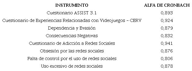 La investigación estuvo orientada al análisis del riesgo en el consumo de derivados del tabaco, bebidas alcohólicas y sustancias psicoactivas y el uso problemático tanto de videojuegos como de redes sociales. Los resultados muestran que el cuestionario ASSIST 3,1, el instrumento de experiencias relacionadas con los videojuegos y el cuestionario de adicción a redes sociales resultan favorables para realizar estudios sobre el consumo de dichas sustancias químicas y las adicciones comportamentales, producto de los análisis de fiabilidad obtenidos.