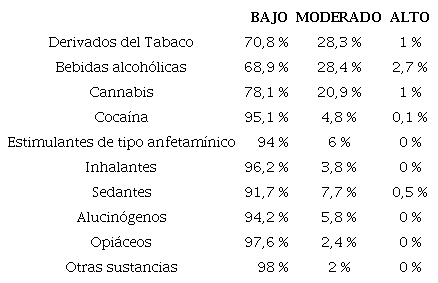 En la Tabla 2 se evidencia que las bebidas alcohólicas, derivados del tabaco y cannabis son las sustancias en las que los estudiantes universitarios presentan mayores niveles de riesgo moderado, en contraste con otras sustancias como opiáceos e inhalantes donde se presentan menor riesgo.