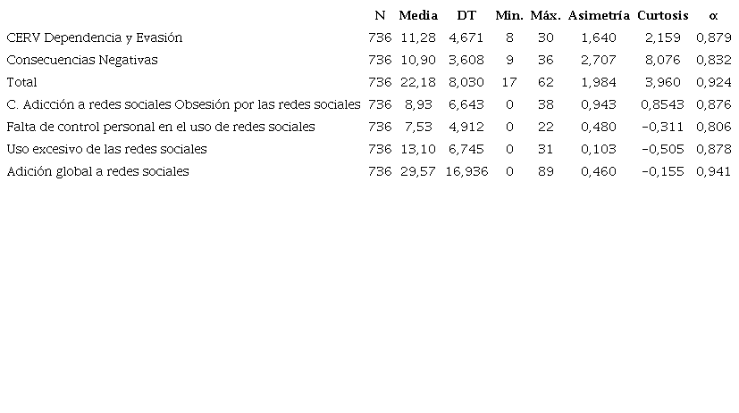 En la Tabla 3 se observan los datos estadísticos descriptivos para el CERV y el cuestionario de adicción a redes sociales, que muestran una asimetría positiva en la totalidad de escalas de los instrumentos y curtosis positivas en las escalas del CERV y obsesión por las redes sociales. En contraste se presentan curtosis negativas en falta de control personal por el uso de redes sociales, uso excesivo de las mismas y adicción global a redes. Al mismo tiempo se pueden consultar los valores de fiabilidad para cada una de sus escalas.