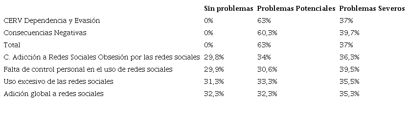 Por otro lado, en la Tabla 4 se observa la presencia de problemas potenciales y severos con los videojuegos y las redes sociales, definiendo tres grupos. El primero se denominó sin problemas, el segundo se llamó problemas potenciales y el tercer grupo se nombró problemas severos. Se resaltan los altos indicadores de presencia de problemas severos en el uso de videojuegos en el 37 % de los participantes y en el uso nocivo de redes sociales en el 35,3 % de los estudiantes universitarios.