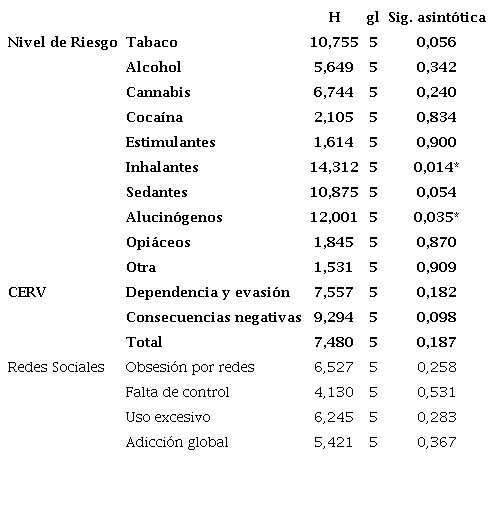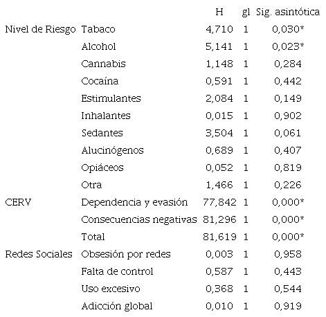 En la Tabla 5 se observan diferencias estadísticamente significativas por sexo en el riesgo por el consumo de tabaco y sustancias alcohólicas, donde presentan mayor riesgo las personas intersexuales (Rango Promedio=443 en tabaco y Rango Promedio=612 en alcohol), sobre hombres (Rango Promedio=386,34 en tabaco y Rango Promedio=379,14 en alcohol) y mujeres (Rango Promedio=353,26 en tabaco y Rango Promedio=359 en alcohol). En las experiencias relacionadas con videojuegos se evidencia mayor uso por los hombres (Rango Promedio=479,91 en dependencia y evasión; Rango Promedio=469,74 en consecuencias negativas; Rango Promedio=479,69 en CERV total) que por las mujeres (Rango Promedio=282,44 en dependencia y evasión; Rango Promedio=290,08 en consecuencias negativas; Rango Promedio=282,63 en CERV total) y las personas intersexuales (Rango Promedio=159,50 en dependencia y evasión; Rango Promedio=222,50 en consecuencias negativas; Rango Promedio=155,50 en CERV total). Finalmente, existen diferencias significativas en obsesión por las redes sociales, su uso excesivo y la adicción global a las redes sociales, hallándose en mayor medida en las mujeres (Rango Promedio=388,70 en obsesión por redes sociales; Rango Promedio=393,69 en uso excesivo de redes; Rango Promedio=389,96 en adicción global a redes) que en los hombres (Rango Promedio=342,57 en obsesión por redes sociales; Rango Promedio=335,76 en uso excesivo de redes; Rango Promedio=340,69 en adicción global a redes).