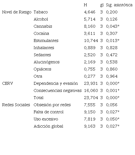 En la Tabla 8 se observan diferencias estadísticamente significativas por etapa del ciclo vital en el nivel de riesgo frente al consumo del cannabis y estimulantes, cuyo mayor riesgo aparece en los jóvenes (Rango Promedio=380,39 en cannabis; Rango Promedio=328,37 en estimulantes) frente a los adolescentes (Rango Promedio=337,70 en cannabis; Rango Promedio=307,32 en estimulantes), los adultos (Rango Promedio=352,17 en cannabis; Rango Promedio=307,07 en estimulantes) y las personas de tercera edad (Rango Promedio=288,00 en cannabis; Rango Promedio=297,50 en estimulantes). Frente a las experiencias relacionadas con videojuegos y uso nocivo de redes sociales se presenta mayor uso en las personas de tercera edad (Rango Promedio=487,00 en dependencia y evasión; Rango Promedio=482,50 en consecuencias negativas; Rango Promedio=480,50 en CERV total; Rango Promedio=703,00 en falta de control; Rango Promedio=527,50 en uso excesivo; Rango Promedio=631,00 en adicción global a redes) frente a los adolescentes (Rango Promedio=366,39 en dependencia y evasión; Rango Promedio=353,29 en consecuencias negativas; Rango Promedio=364,01 en CERV total; Rango Promedio=350,40 en falta de control; Rango Promedio=349,42 en uso excesivo; Rango Promedio=343,95 en adicción global a redes), los jóvenes (Rango Promedio=394,11 en dependencia y evasión; Rango Promedio=388,78 en consecuencias negativas; Rango Promedio=394,33 en CERV total; Rango Promedio=383,41 en falta de control; Rango Promedio=384,36 en uso excesivo; Rango Promedio=384,77 en adicción global a redes) y los adultos (Rango Promedio=311,44 en dependencia y evasión; Rango Promedio=327,54 en consecuencias negativas; Rango Promedio=311,74 en CERV total; Rango Promedio=339,37 en falta de control; Rango Promedio=338,42 en uso excesivo; Rango Promedio=338,76 en adicción global a redes).