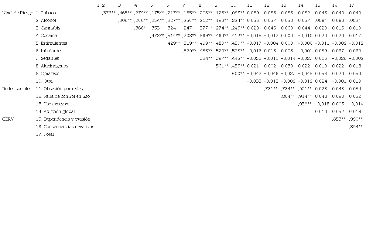 La Tabla 9 evidencia la presencia de correlaciones altamente significativas entre el nivel de riesgo de consumo de diferentes sustancias, la adicción a redes sociales y el uso problemático de videojuegos; se resalta que el riesgo de consumo de bebidas alcohólicas y derivados del tabaco presentan una correlación positiva y significativa sobre el nivel de riesgo frente a las demás sustancias psicoactivas. Asimismo, se encuentra que el nivel de riesgo frente al consumo de alcohol presenta una correlación en nivel 0,05 con el uso nocivo de los videojuegos, de manera especial en la dimensión de dependencia y evasión y en la puntuación total de las experiencias relacionadas con videojuegos.