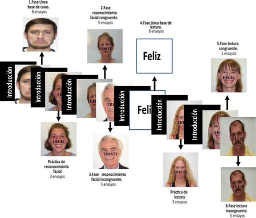 Para este proyecto se programó la tarea en el software Unity. En cuanto a su estructura, el test está dividido en ocho fases y compuesto por 42 ensayos en total (ver Figura 1), cada uno con un tiempo máximo de respuesta de 3000 milisegundos (ms). En las cuatro primeras fases, el participante deberá contestar teniendo en cuenta el rostro, estas son: línea de base caras con ocho ensayos, práctica de reconocimiento fácil con dos ensayos, reconocimiento facial congruente (cara y palabra referidas a la misma emoción) y reconocimiento facial incongruente (cara y palabra no coinciden); por otra parte, en las cuatro fases restantes se deberá contestar a partir de la palabra escrita, estas son: línea base lectura, práctica de lectura, lectura congruente y lectura incongruente. Cabe aclarar, que los ensayos de práctica tanto de reconocimiento facial como de lectura no se tienen en cuenta para los análisis estadísticos.