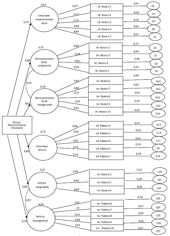 Otro hallazgo importante del AFC es la covarianza entre el factor dos y tres (fase de reconocimiento facial congruente y la fase de reconocimiento facial incongruente) y el factor cinco y seis (fase de lectura congruente y fase de lectura incongruente), cuyos pesos factoriales son 46 % y 57 % respectivamente. Estas relaciones son posibles de explicar por la comunalidad que tiene las fases en su objetivo de respuesta, es decir, que la fase dos y tres comparten la instrucción de responder a la imagen de expresión facial, por otra parte, la fase cinco y seis a la instrucción de lectura de la palabra (respuestas automatizadas). De otra parte, se evidenció que el modelo final de seis factores se asemeja a la estructura del instrumento de reconocimiento emocional facial, propuesto por Rojas (2017). Con los resultados encontrados en el AFE y AFC fue posible establecer que el instrumento tiene validez de constructo, es decir, que evalúa la capacidad de control de una interferencia en el reconocimiento facial y la lectura emocional, lo que significa que la persona, en el desarrollo de la tarea, debe inhibir su respuesta automática ante estímulos incongruentes para tener un desempeño adecuado durante esta.