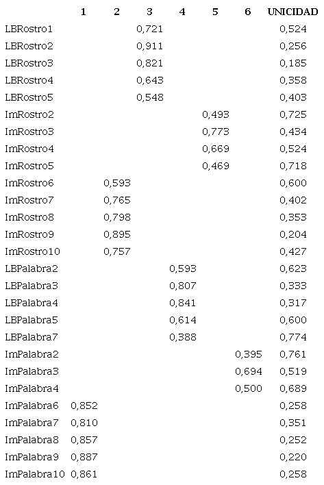 Como puede observarse, la estructura cuenta con seis factores que se relacionan con las fases propuestas en la estructura inicial del instrumento Stroop reconocimiento emocional caras y palabras. En el procedimiento del análisis factorial se eliminaron los ensayos LBRostro6, LBRostro7, LBRostro8, ImRostro1, LBPalabra1, LBPalabra8 y el ensayo ImPalabra1 porque cargaban en dos factores y generaban ambigüedad. Por otra parte, se encontró que el modelo resultante explica el 50,32 % de la varianza total (Tabla 2).