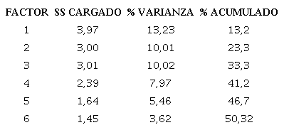 A partir de este procedimiento se obtuvo un total de seis factores, el filtro aplicado sobre las cargas factoriales presentó como resultado la estructura expuesta a continuación (Tabla 1).