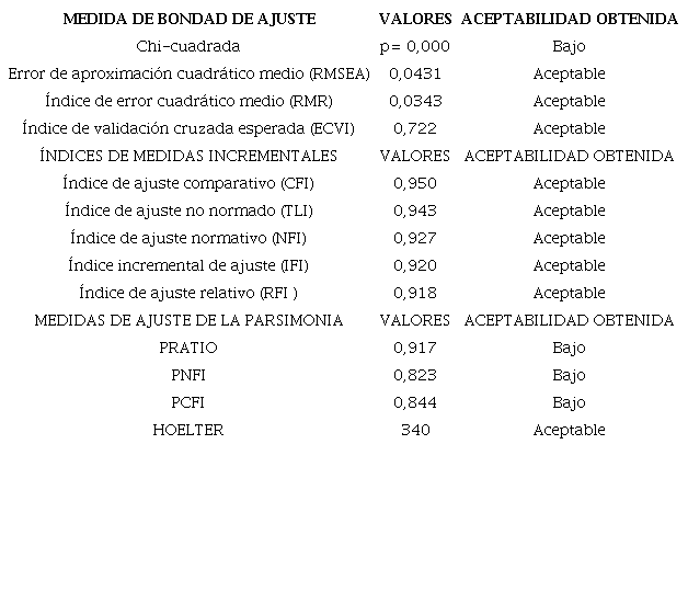 Como se evidencia en la Tabla 3, los cuatro índices de las medidas incrementales asumieron valores que se ajustan a los requerimientos de cada uno. Aunque los índices de bondad de ajuste presentaron puntuaciones un poco alejadas de lo establecido, los resultados de las medidas incrementales muestran que el modelo presenta un ajuste favorable. Por tanto, se decide aceptar el modelo de los seis factores presentado a continuación.