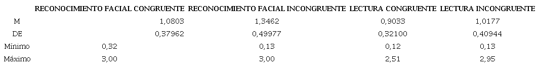 Los resultados encontrados evidencian la existencia de diferencias estadísticamente significativas entre las cuatro fases de congruencia-incongruencia del instrumento; con ello se comprueba que los ensayos de reconocimiento facial incongruentes tienen un mayor tiempo de latencia que los ensayos congruentes. Del mismo modo, se evidencia que los ensayos incongruentes de lectura presentan una mayor latencia de respuesta frente a los ensayos congruentes. Otro hallazgo importante es que se encuentra un mayor tiempo en la respuesta entre los ensayos incongruentes de reconocimiento facial (M=1,3462) en comparación con los de lectura (M=1,0177), esto indica la existencia de una mayor interferencia en la fase de reconocimiento facial con ensayos incongruentes. De acuerdo con esto, es posible establecer que el reconocimiento facial emocional es un proceso controlado, que implica un mayor nivel de procesamiento en comparación con el proceso de lectura que es automático.