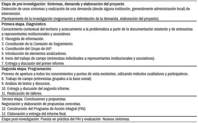 En procesos de cambio social, desde la base, la introducción de la IAP parte del modelo propuesto por Martí Olivé (2000) del cual se adoptan las etapas y fases de investigación expuestas en la tabla 1, y que de las que el presente artículo ofrece una exposición hasta el finalizar la primera etapa.