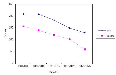 Haciendo un análisis en retrospectiva, se puede advertir con mayor detalle la magnitud del desplome en los precios. Así, por ejemplo, si se toma el período comprendido entre 1751 y 1760, las estadísticas arrojadas para el caso de Girón y Socorro indican promedios de 212 y 205 pesos, respectivamente (CDIHR-UIS, Archivo Notarial de Girón, t. 8-11; CCHRP. Archivo Notarial del Socorro, t. 10-14). Valores estos que contrastan con los estimativos obtenidos durante el decenio 1811-1820 cuando los datos en esas dos localidades demuestran que se dieron promedios de 165 y 110 pesos, respectivamente. De lo anterior se colige que el decrecimiento de los precios alcanzó el 35 %.