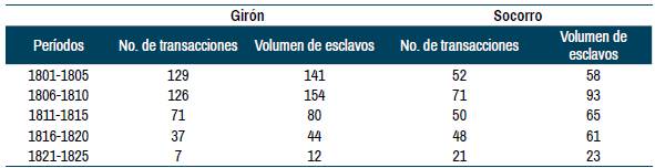 Las cifras sobre el comercio esclavista, que serán analizadas a continuación, ayudan a entender los efectos de la agitada realidad vivida en estas comarcas. Los datos aquí estudiados fueron extraídos por el autor de este artículo de las escrituras de compra y venta de esclavos registradas en la ciudad de Girón y en la villa del Socorro, dos de los más pujantes centros urbanos de esa franja nororiental de la Nueva Granada.