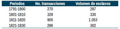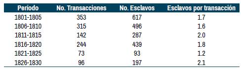 Tal como lo muestra esta tabla, la cual registra datos recopilados por el historiador Pablo Rodríguez, el número de transacciones y el volumen de esclavos en Popayán habían mostrado una desaceleración en la primera década del siglo XIX. Después, durante el período comprendido entre 1811 y 1815, el descenso se hizo más pronunciado reduciéndose estos dos indicadores en aproximadamente un 50 %, mientras que en el siguiente lapso de tiempo se registró una notable recuperación en la que prácticamente se duplicaron las cifras. Este repunte del comercio en la época de Reconquista se explica por ser esta zona precisamente de orientación prorealista. Luego, en el siguiente quinquenio, que coincide con los primeros años de vida republicana, los números experimentan un crítico descenso en medio de un ambiente de devastación como producto del efecto prolongado del conflicto. De ahí en adelante se notó un leve repunte.